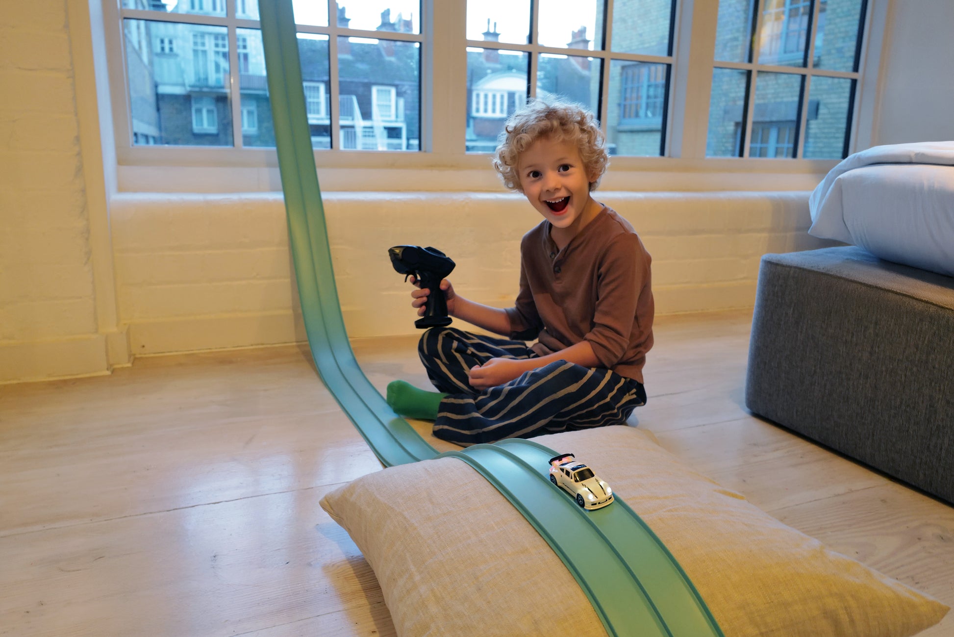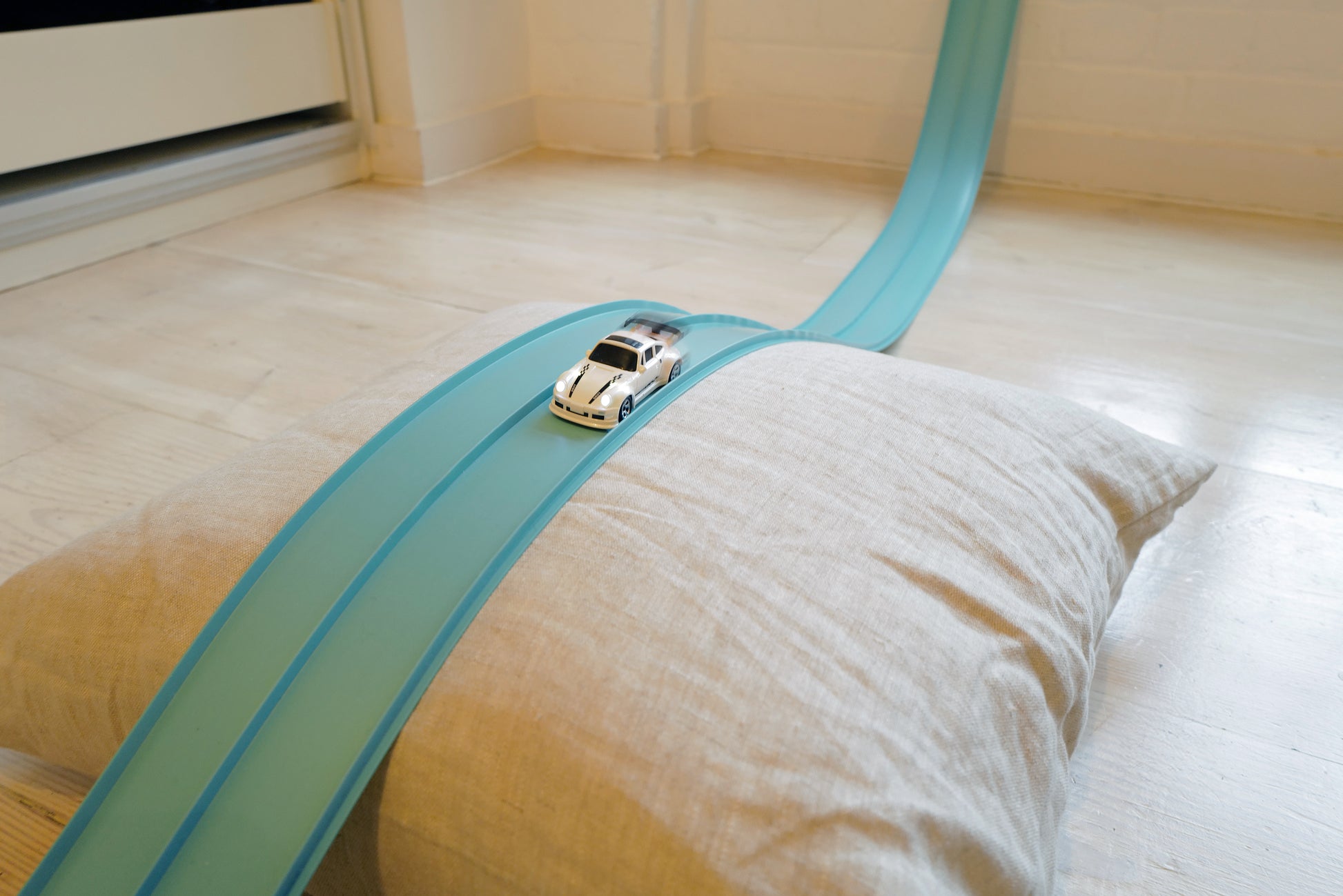 Super Circuit, die einzigartige Rennstrecke für Autos mit zwei flexiblen Bahnen. Unglaublich einfach zu benutzen, drinnen wie draußen. Ihr Kind kann alleine oder mit anderen spielen und seiner Kreativität freien Lauf lassen, indem es Alltagsgegenstände verwendet, um Hügel, Sprünge, Tunnel und sogar Loopings zu erstellen!